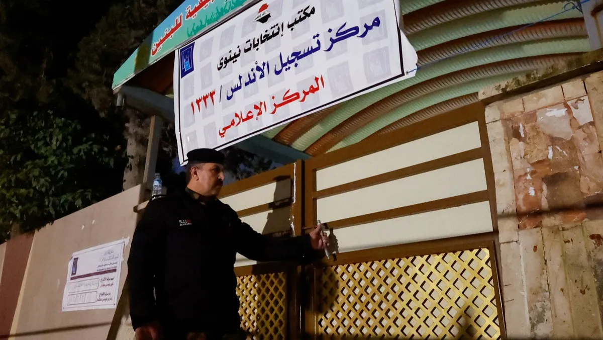 أحد عناصر الأمن يغلق مركز اقتراع بعد انتهاء عملية التصويت في انتخابات مجلس محافظة العراق، في الموصل، العراق. 18 ديسمبر 2023 - Reuters