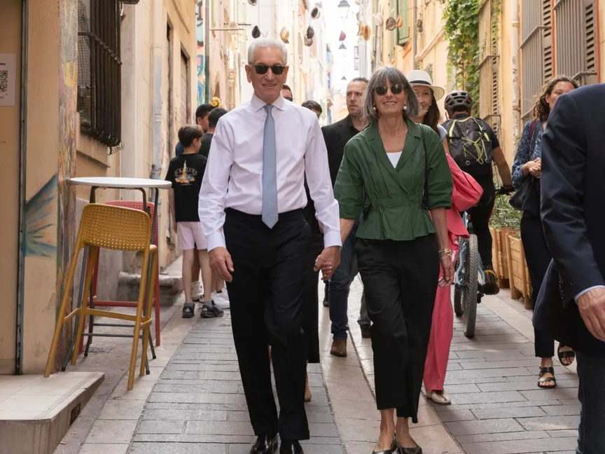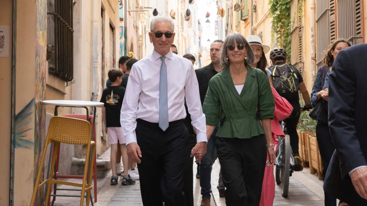 السفير الأميركي في فرنسا تشارلز كوشنر يتجول مع زوجته في مدينة مرسيليا الفرنسية، 10 أغسطس 2025 - USAmbFrance
