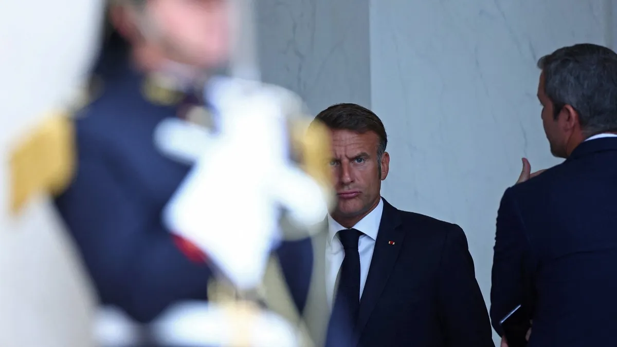 الرئيس الفرنسي إيمانويل ماكرون يقف خارج قصر الإليزيه في باريس. 27 أغسطس 2025 - Reuters