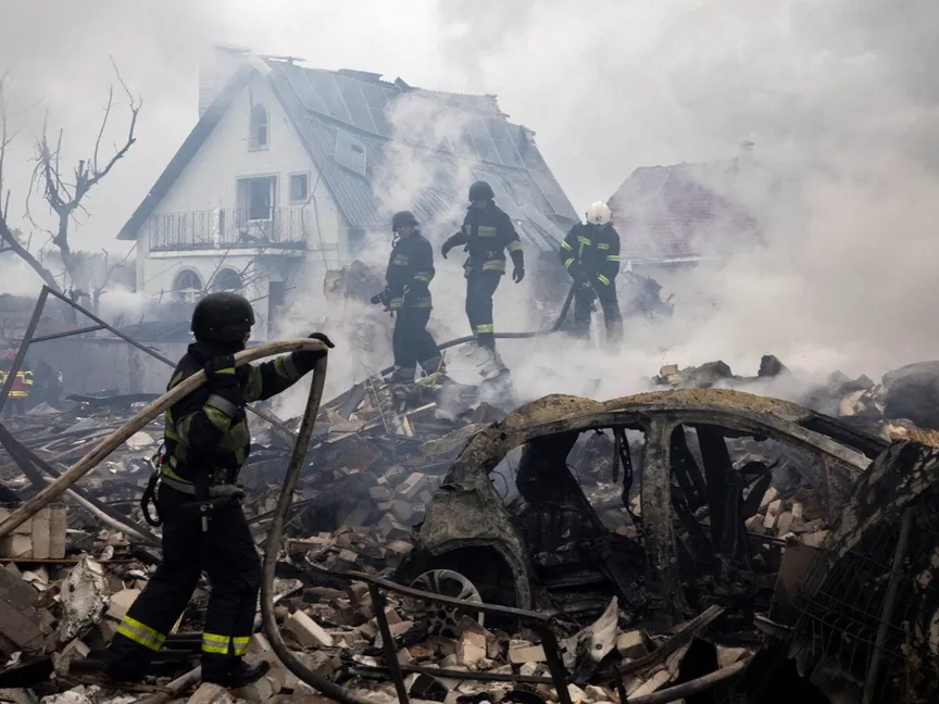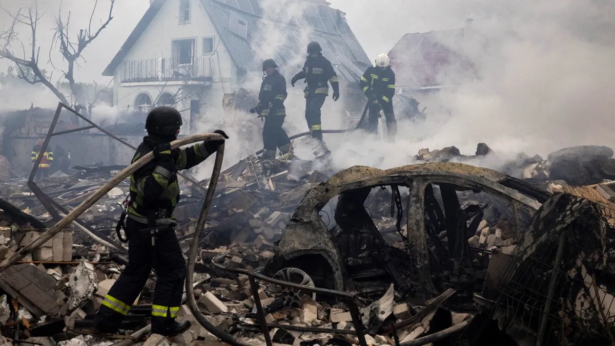 فرق الطوارئ الأوكرانية في موقع ضربة صاروخية روسية بمارخاليفكا بمنطقة كييف في أوكرانيا. 25 مايو 2025 - REUTERS