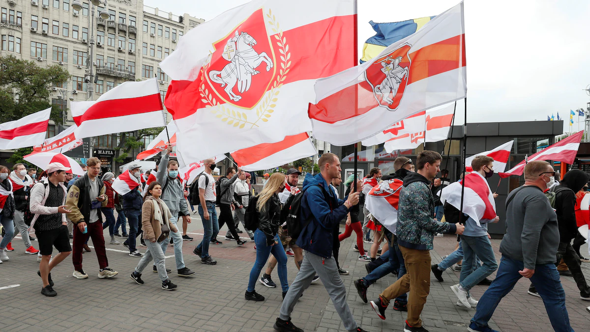نشطاء يحملون أعلاماً تاريخية لبيلاروسيا وهم يسيرون خلال مسيرة لدعم الحركة البيلاروسية المناهضة للحكومة والمدون المعتقل رومان بروتاسيفيتش، في كييف، أوكرانيا. 30 مايو 2021 - REUTERS