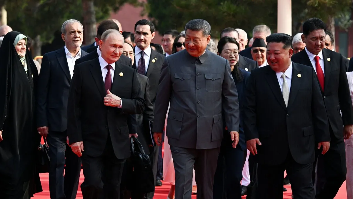 ومن الميدان السماوي تيانانمين، ترأس شي عرضاً عسكرياً استمر 90 دقيقة لإحياء ذكرى نهاية الحرب العالمية الثانية. وعلى يمينه وقف بوتين الذي يخوض حرباً في أوكرانيا، لم تشهدها أوروبا منذ نهاية الحرب العالمية الثانية، التي احتفى العرض بمرور 80 عاماً على نهايتها، وعلى يساره الزعيم الكوري الشمالي الذي يمد ساحات القتال الروسية في أوكرانيا، بالجنود والأسلحة.