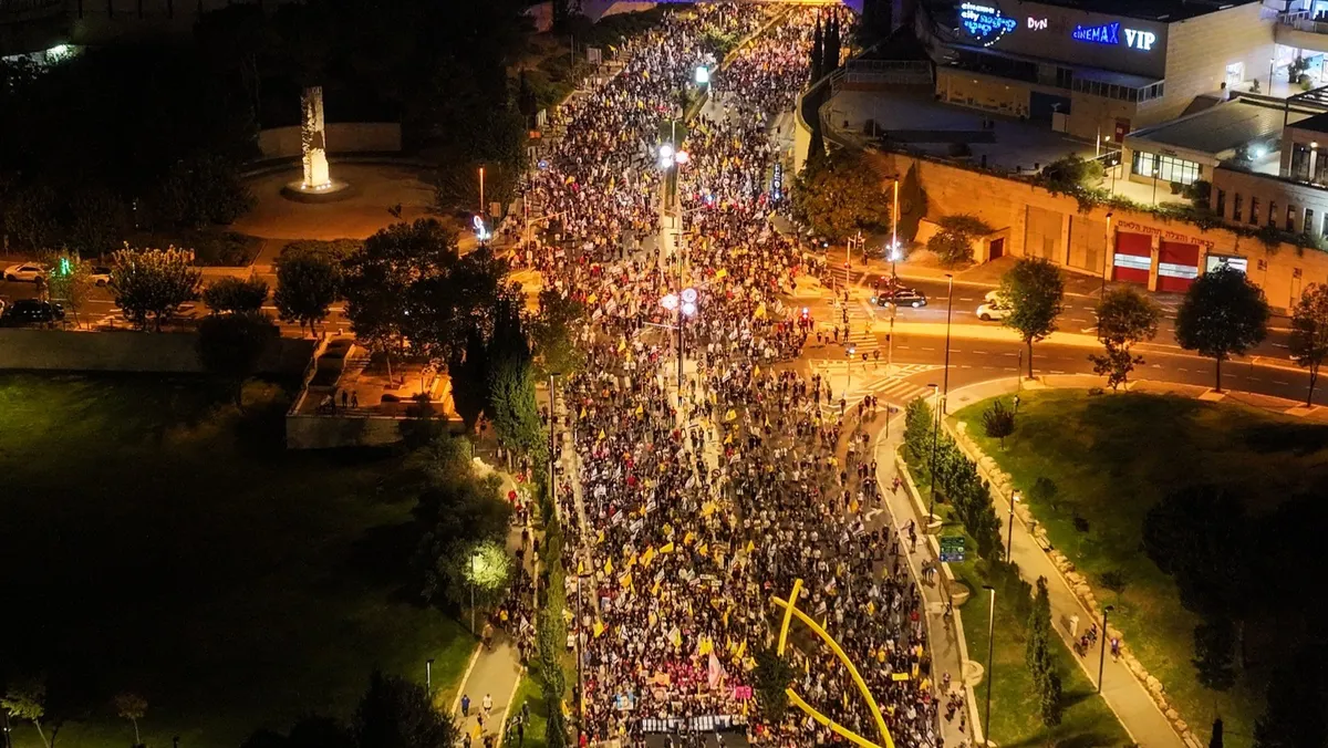وتشهد تل أبيب مظاهرات أسبوعية يتزايد حجمها وسط مطالبات للحكومة بالتوصل إلى وقف إطلاق النار في غزة، من أجل إطلاق سراح المحتجزين بالقطاع. وقال المنظمون، إن مظاهرات السبت شارك فيها عشرات الآلاف من المحتجين في القدس وتل أبيب.