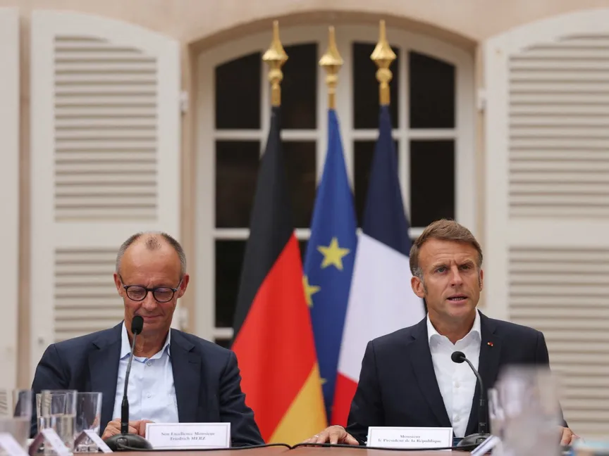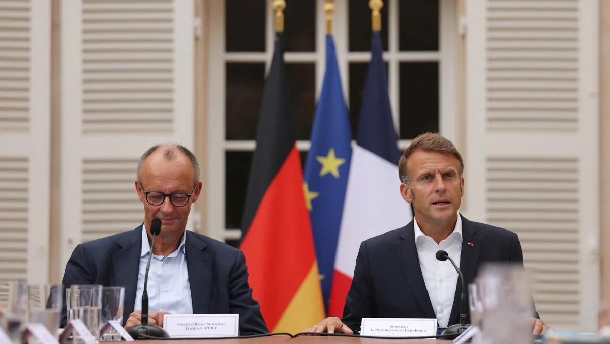 الرئيس الفرنسي إيمانويل ماكرون والمستشار الألماني فريدريش ميرتس خلال مؤتمر صحافي في باريس. 28 أغسطس 2025 - REUTERS