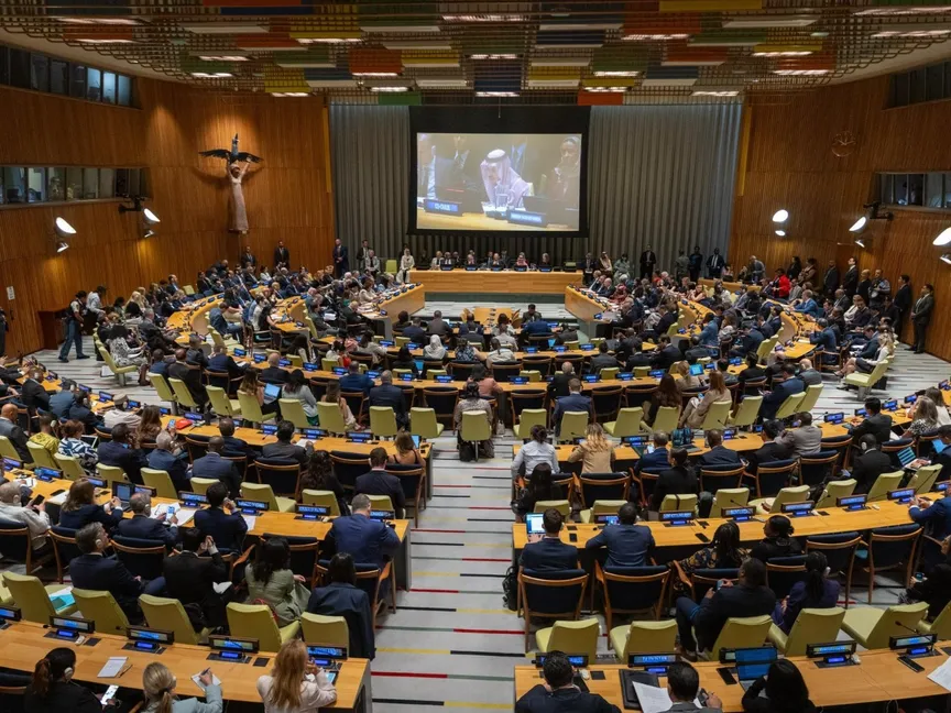 وزير الخارجية السعودي الأمير فيصل بن فرحان يلقي كلمة أمام الجلسة الثالثة لمؤتمر حل الدولتين لتسوية القضية الفلسطينية، نيويورك، 28 يوليو 2025 - x/KSAmofaEN