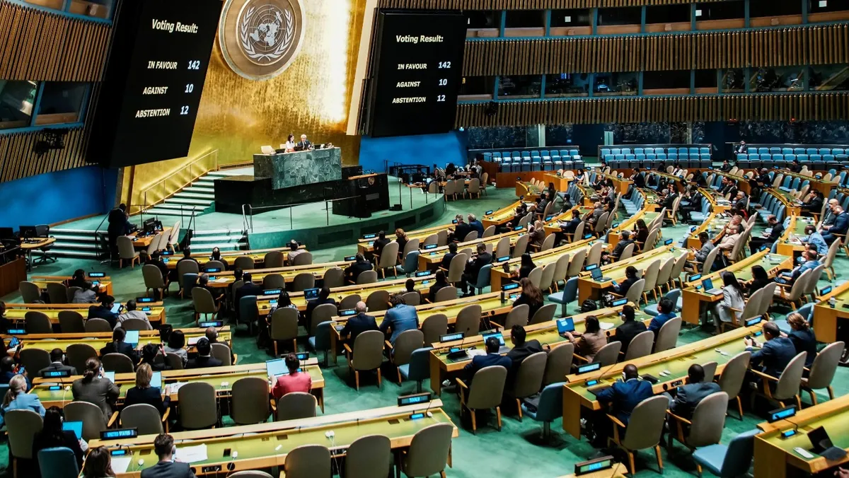 وصوتت الجمعية العامة للأمم المتحدة على إعلان يحدد خطوات ملموسة نحو حل الدولتين بين إسرائيل والفلسطينيين، وذلك بأغلبية 142 صوتاً، مقابل معارضة عشر دول بينما امتنعت 12 دولة عن التصويت.