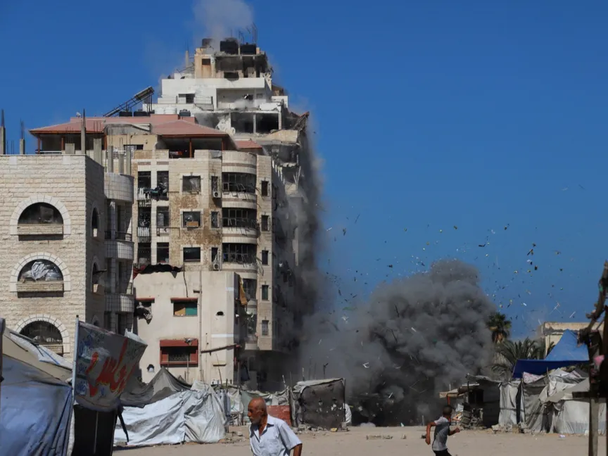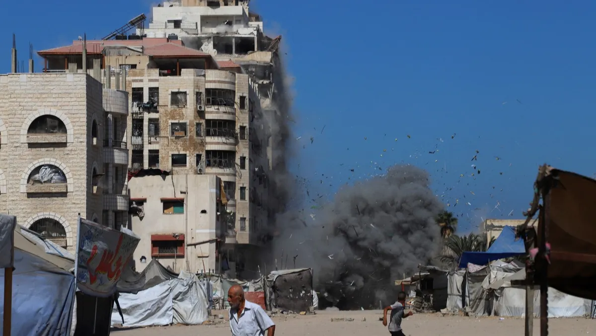 فلسطينيون يركضون بينما يتصاعد الدخان من مبنى سكني قصفه الجيش الإسرائيلي في مدينة غزة. 14 سبتمبر 2025 - Reuters
