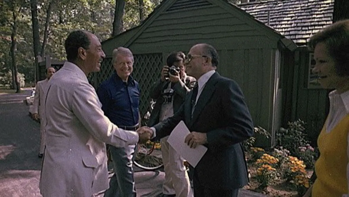 الرئيس المصري أنور السادات (يسار) يصافح رئيس الوزراء الإسرائيلي مناحيم بيجن في قمة كامب ديفيد كما يظهر جيمي كارتر الرئيس الأميركي الأسبق في ماريلاند، الولايات المتحدة. 7 سبتمبر 1978 - REUTERS