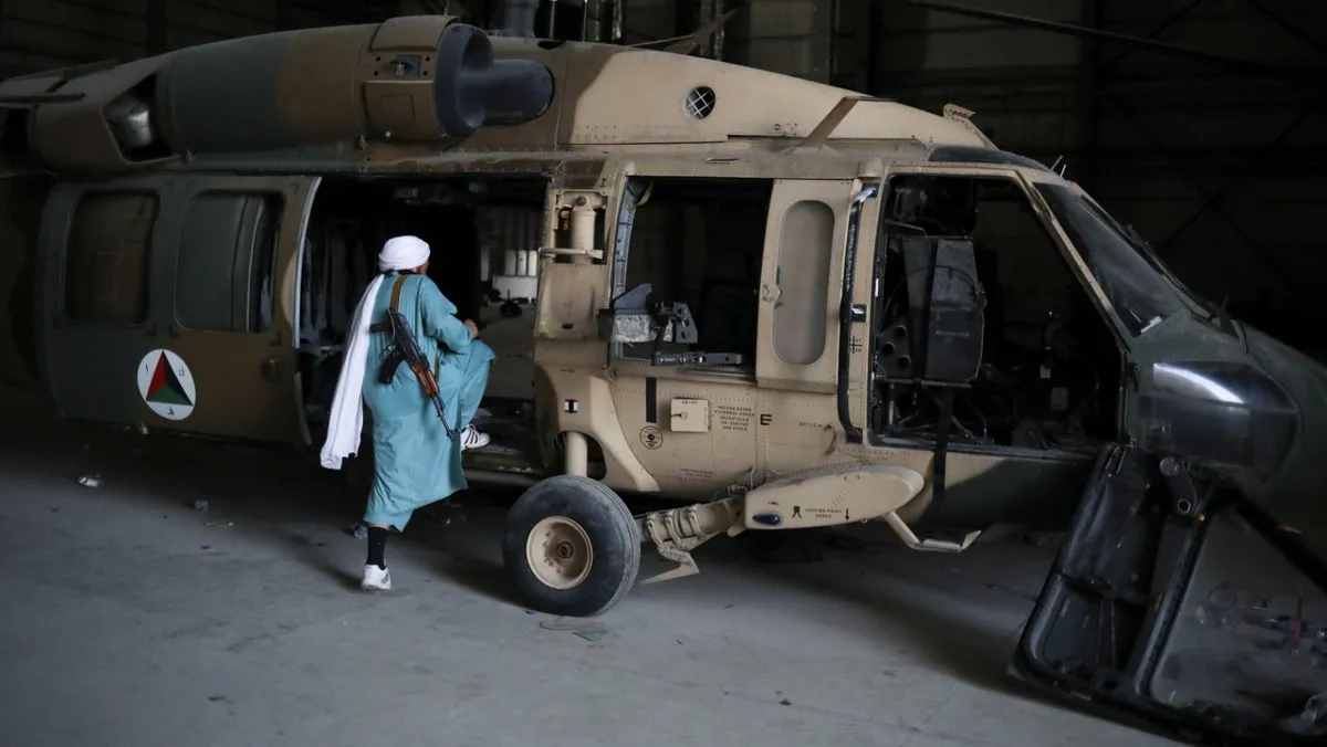 عنصر تابع لحركة طالبان يركب طائرة هليكوبتر في قاعدة باجرام الجوية التي تقع على مسافة 50 كيلومتراً من العاصمة كابول. 23 سبتمبر 2021 - REUTERS