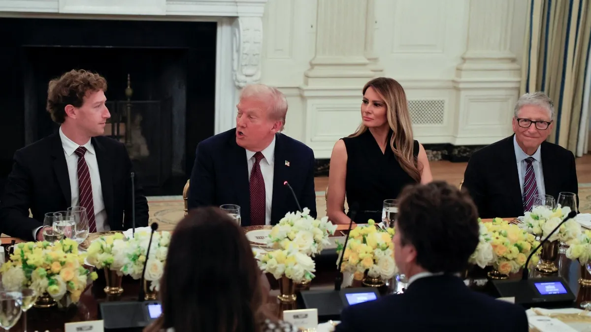 الرئيس الأميركي دونالد ترمب والسيدة الأولى ميلانيا ترمب والرئيس التنفيذي لشركة ميتا مارك زوكربيرج والمؤسس المشارك لشركة مايكروسوفت بيل جيتس يحضرون عشاء خاصاً لقادة التكنولوجيا في البيت الأبيض بواشنطن. 4 سبتمبر 2025 - Reuters