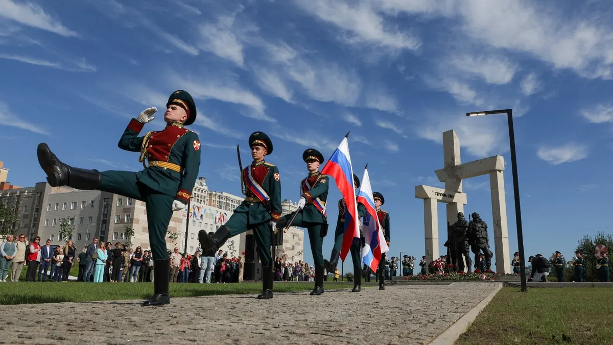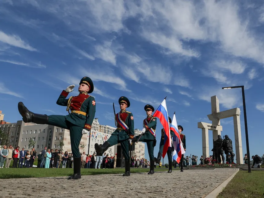 جنود روس يشاركون في حفل الكشف عن نصب تذكاري لجنود شاركوا في الحرب على أوكرانيا في بلدة كودروفو بالقرب من مدينة سانت بطرسبرج. 12 سبتمبر 2025 - REUTERS