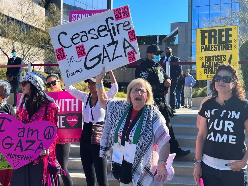 ناشطات متضامنات مع فلسطين يتظاهرن أمام مكاتب وكالات وشركات هوليوود في بيفرلي هيلز بولاية كاليفورنيا. 5 ديسمبر 2023 - Reuters