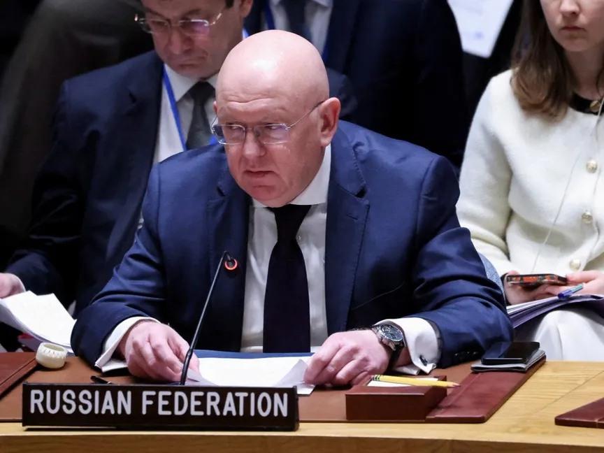ممثل روسيا لدى الأمم المتحدة فاسيلي نيبينزيا خلال جلسة في مقر المنظمة بمدينة نيويورك- 25 مارس 2024 - Reuters