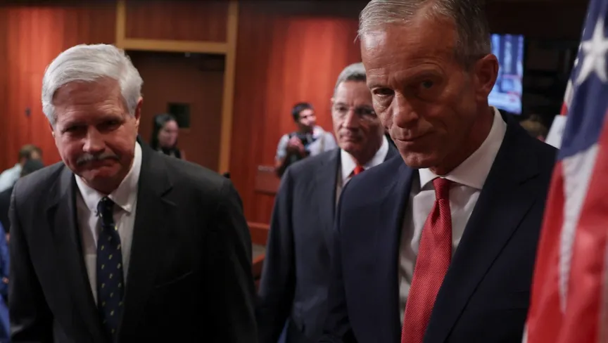 زعيم الأغلبية الجمهورية في مجلس الشيوخ الأميركي جون ثون، والسيناتور جون هوفن والسيناتور جون باراسو يغادرون بعد مؤتمر صحافي عقب تصويت مجلس الشيوخ، قبل ساعات من سريان الإغلاق الحكومي، واشنطن، الولايات المتحدة، 30 سبتمبر 2025. - REUTERS