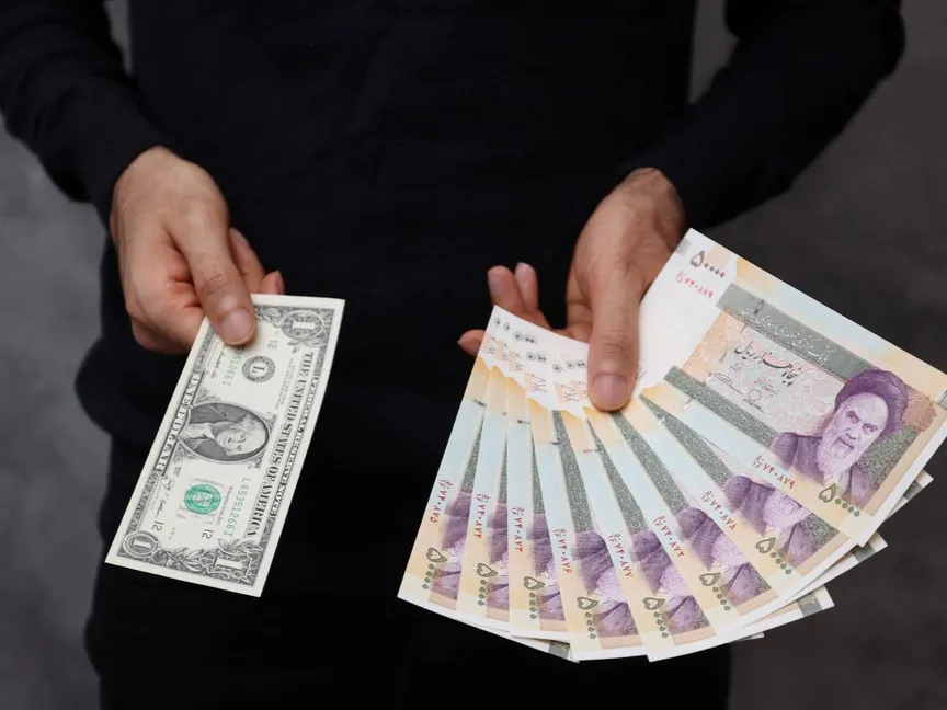 تاجر عملات يحمل ورقة نقدية من فئة دولار أميركي واحد، والمبلغ المقابل له عند تحويله إلى الريال الإيراني، داخل محل صرافة في طهران، إيران، 25 ديسمبر 2022 - REUTERS