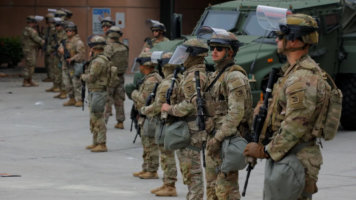 أفراد من الحرس الوطني يقفون أمام المجمع الفيدرالي وسط مدينة لوس أنجلوس بولاية كاليفورنيا. 8 يونيو 2025 - Reuters
