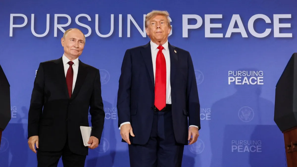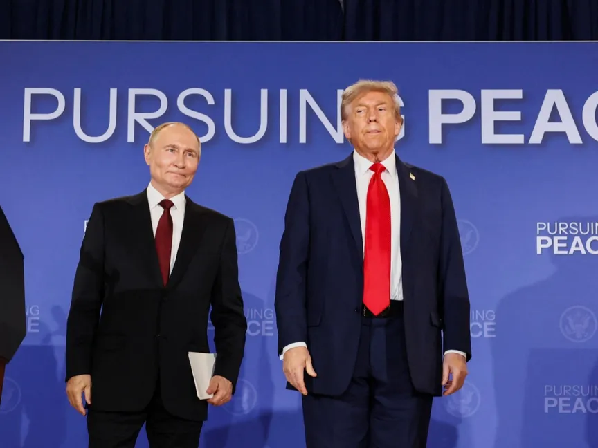 الرئيس الأميركي دونالد ترمب والروسي فلاديمير بوتين خلال مؤتمر صحافي مشترك في ألاسكا. 15 أغسطس 2025 - Reuters