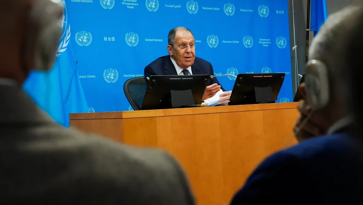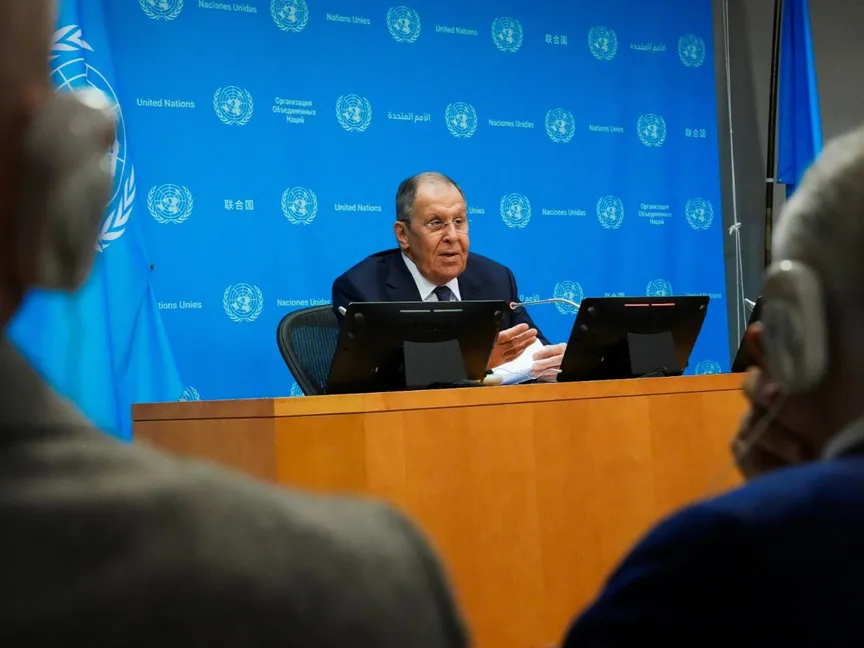 وزير الخارجية الروسي سيرجي لافروف خلال مؤتمر صحافي بعد إلقاء كلمة أمام الجمعية العامة للأمم المتحدة في نيويورك- 27 سبتمبر 2025 - Reuters