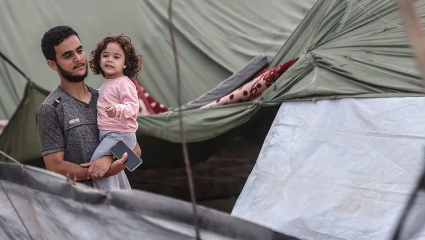 أب فلسطيني يحمل ابنته بين خيام النازحين في خان يونس جنوبي قطاع غزة في أعقاب إعلان اتفاق وقف إطلاق النار. 9 أكتوبر 2025 - Getty Images