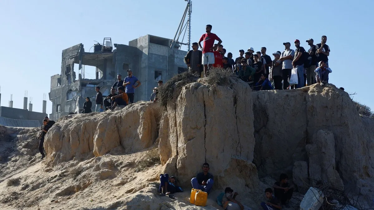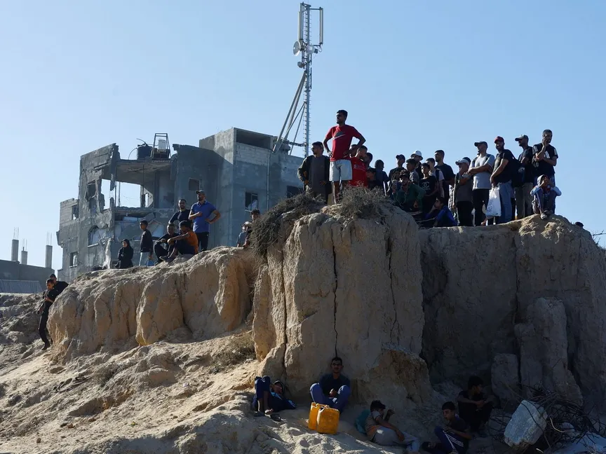 نازحون فلسطينيون ينتظرون العودة إلى الشمال بعد أن صادقت الحكومة الإسرائيلية على اتفاق لوقف إطلاق النار مع حركة حماس، وسط قطاع غزة، 10 أكتوبر 2025. - REUTERS
