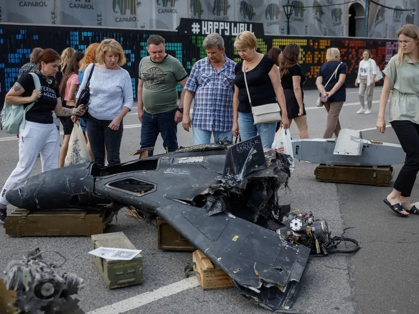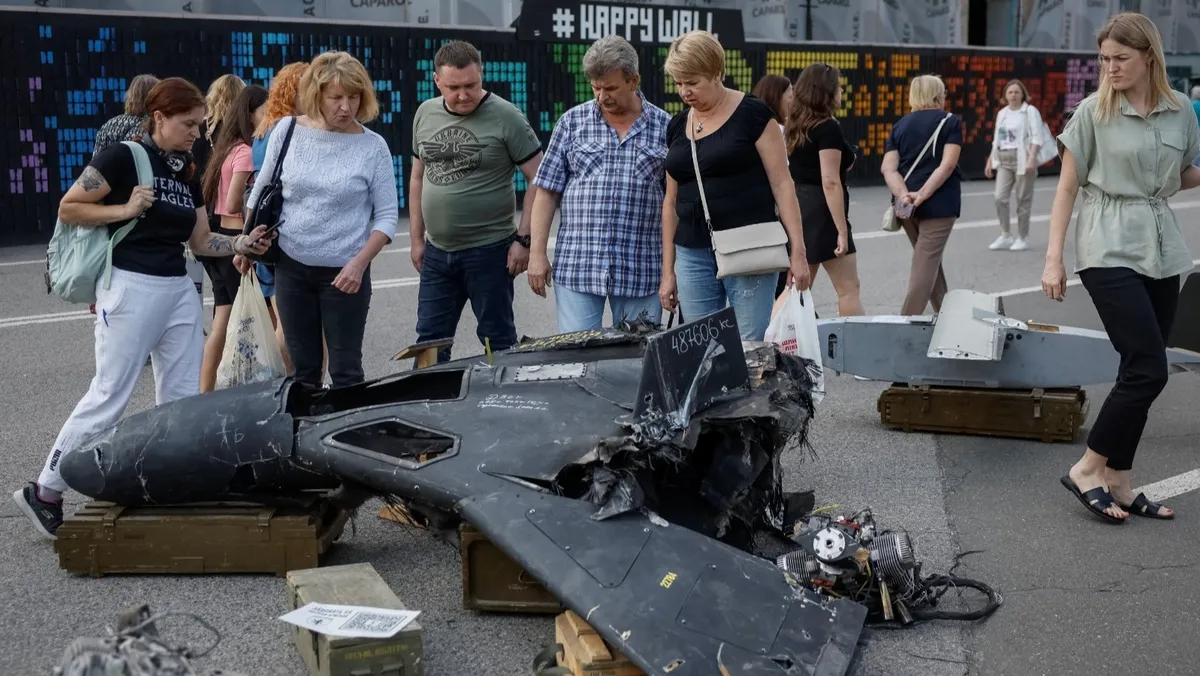 أشخاص ينظرون إلى طائرة روسية مسيرة مدمرة أثناء زيارتهم لمعرض تابع للقوات المسلحة الأوكرانية وسط كييف. 8 أغسطس 2025 - REUTERS