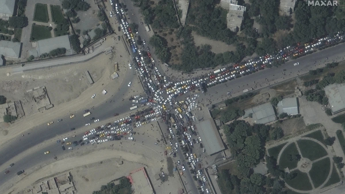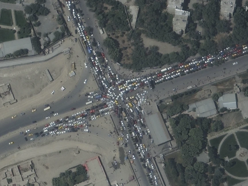 صورة التقطت عبر الأقمار الصناعية تتظهر ازدحاماً مرورياً وحشوداً قرب مطار حامد كرزاي الدولي في كابول في أفغانستان - AFP