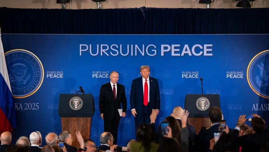 الرئيس الروسي فلاديمير بوتين ونظيره الأميركي دونالد ترمب خلال مؤتمر صحافي مشترك في قاعدة إلمندورف ريتشاردسون المشتركة في أنكوريج بولاية ألاسكا الأميركية. 15 أغسطس 2025 - Bloomberg