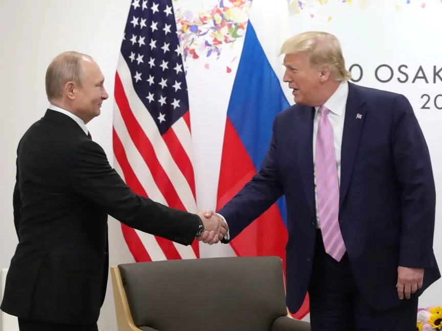مصافحة بين الرئيس الأميركي دونالد ترمب ونظيره الروسي فلاديمير بوتين خلال قمة مجموعة العشرين في اليابان. 2019 - REUTERS
