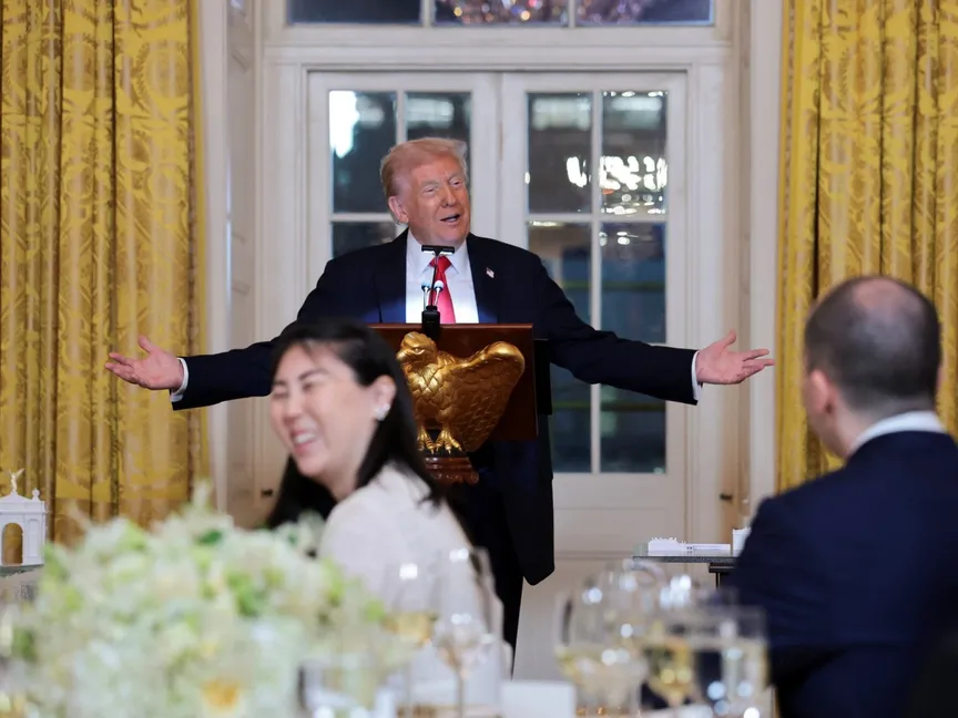 الرئيس الأميركي دونالد ترمب يتحدث خلال حفل عشاء في البيت الأبيض. 15 أكتوبر 2025 - REUTERS