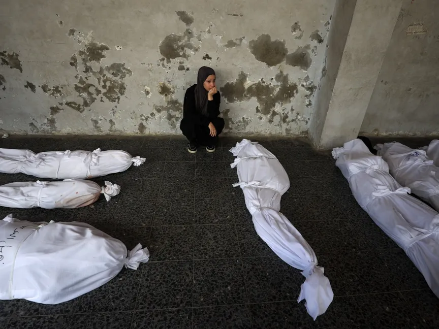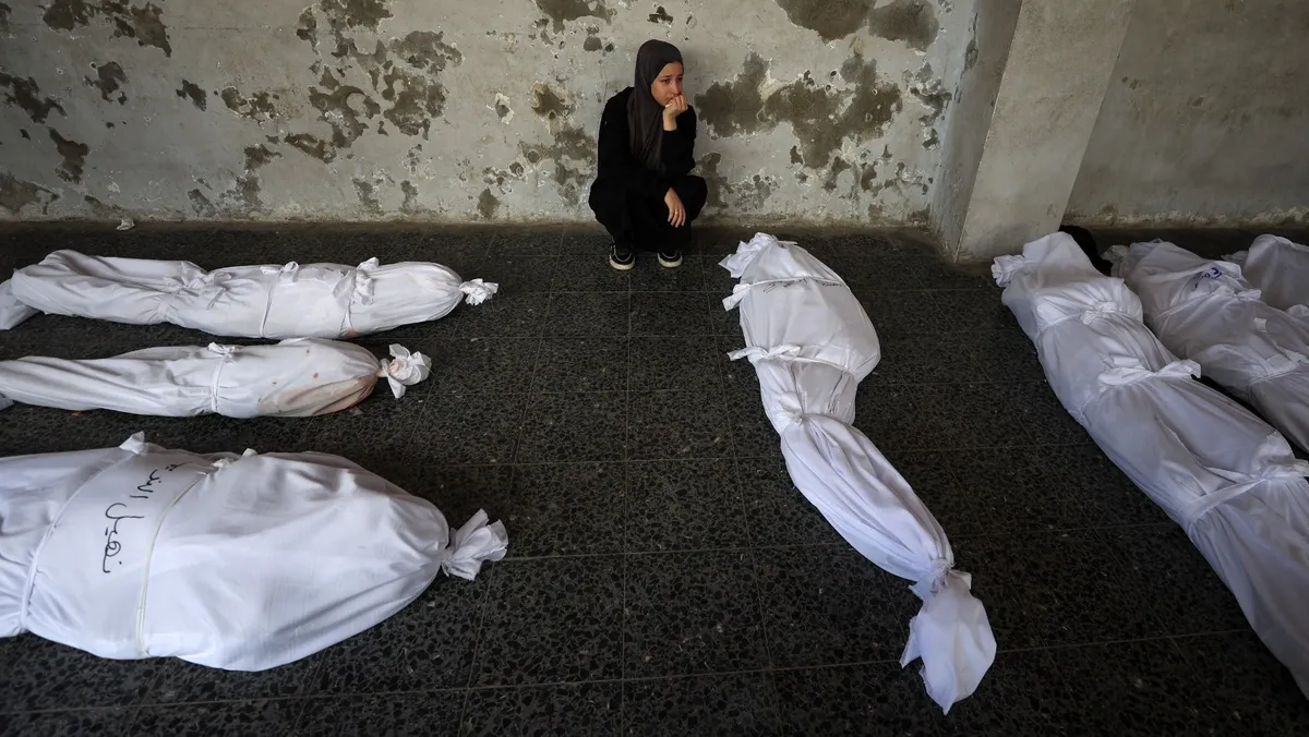فلسطينية تجلس وسط جثامين ضحايا غارات إسرائيلية على غزة في المستشفى الأهلي العربي المعروف بـ"المعمداني" في حي الزيتون. 12 أغسطس 2025 - REUTERS