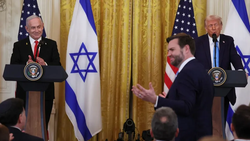 نائب الرئيس الأميركي جي دي فانس يقف بينما يعقد دونالد ترمب ورئيس الوزراء الإسرائيلي بنيامين نتنياهو مؤتمراً صحفياً مشتركاً في البيت الأبيض. 4 فبراير 2025 - REUTERS