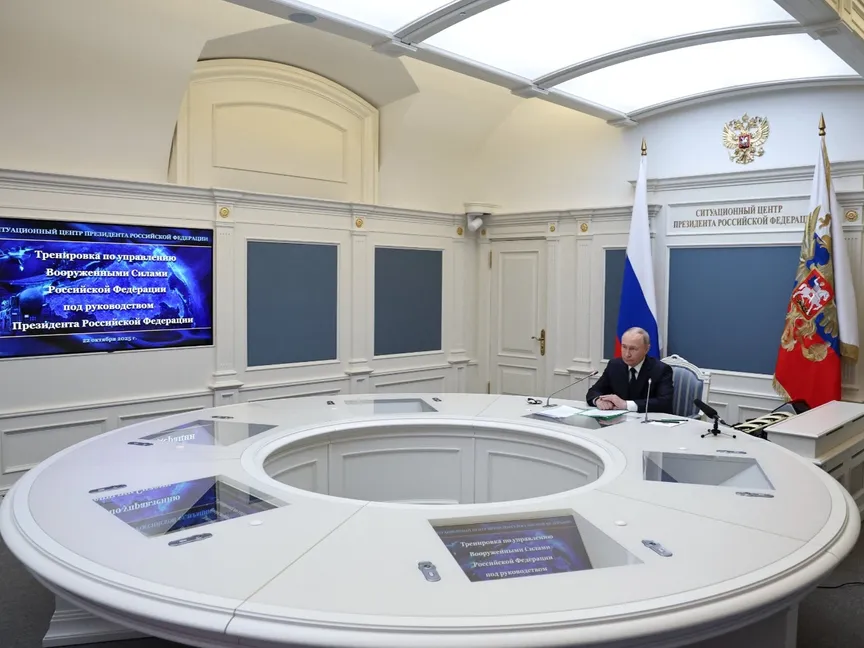 الرئيس الروسي فلاديمير بوتين يتابع مناورات عسكرية للقوات النووية للبلاد لاختبار جاهزيتها، عبر رابط فيديو من موسكو، روسيا. 22 أكتوبر 2025 - Reuters