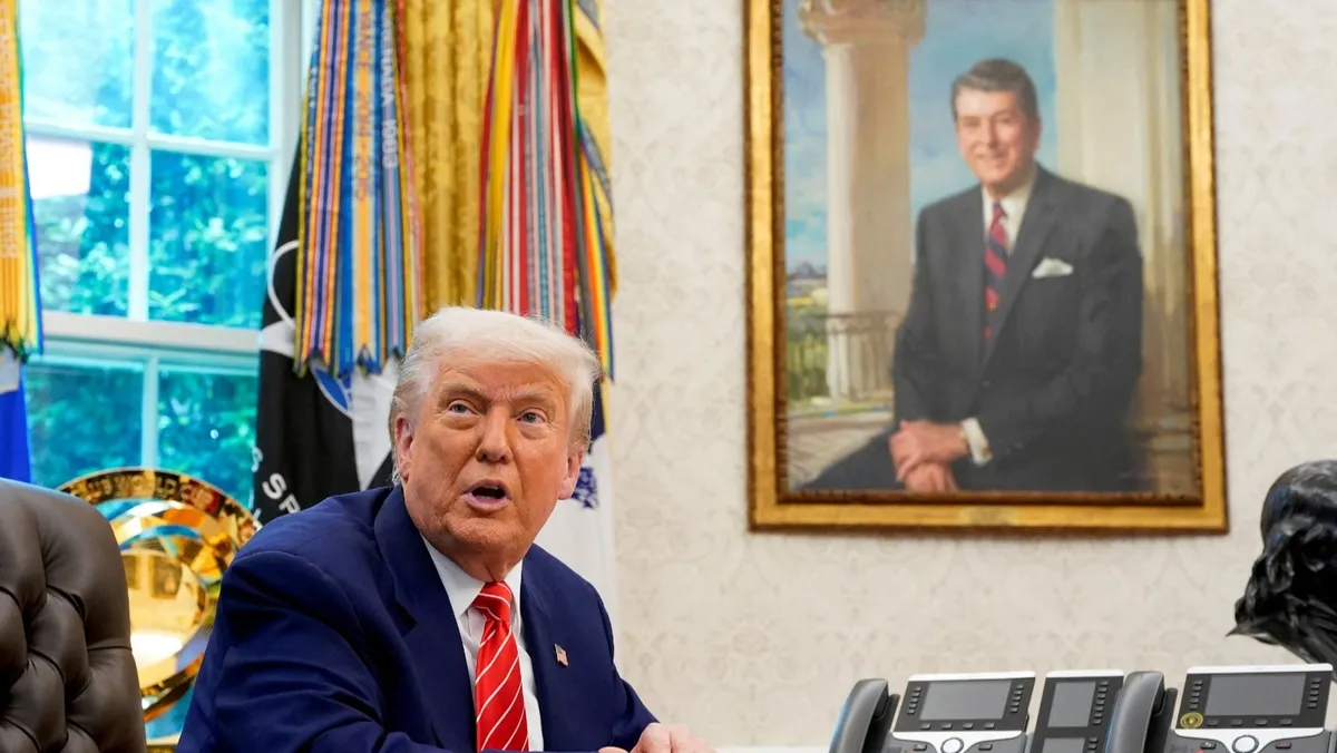 الرئيس الأميركي دونالد ترمب وفي الخلفية بورترية للرئيس الراحل رونالد ريجان، 30 مايو 2025 - REUTERS