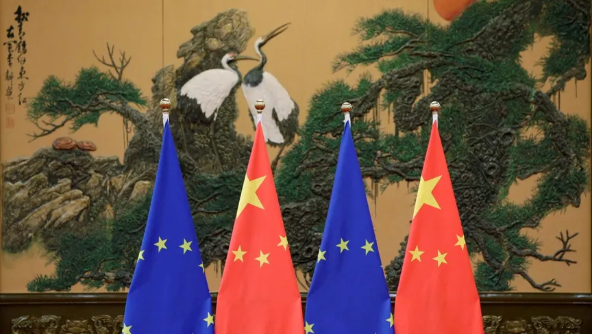 أعلام الصين والاتحاد الأوروبي خلال قمة بين الجانبين في قاعة الشعب الكبرى بالعاصمة الصينية بكين. 12 يوليو 2016 - REUTERS