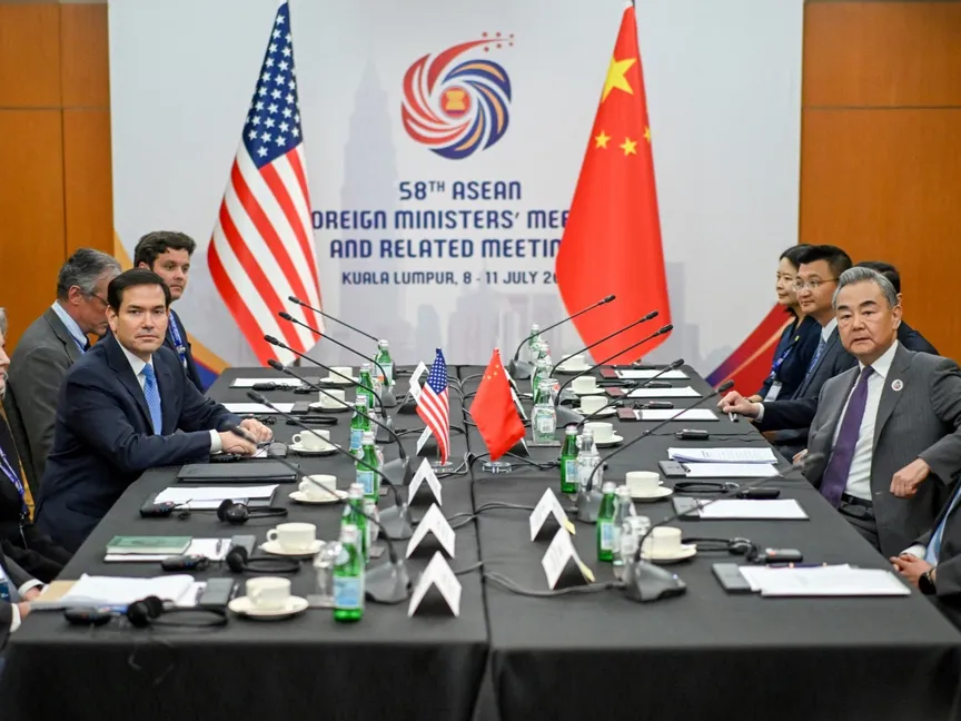 وزير الخارجية الأميركي ماركو روبيو خلال لقاء مع نظيره الصيني وانج يي على هامش اجتماع وزراء خارجية رابطة "آسيان" في ماليزيا. 11 يوليو 2025 - REUTERS