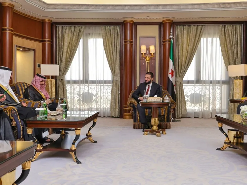 واستقبل الشرع وزير الخارجية السعودي الأمير فيصل بن فرحان في مقر إقامته بالرياض، بحضور وزير الخارجية السوري أسعد الشيباني، على هامش حضوره للمؤتمر.