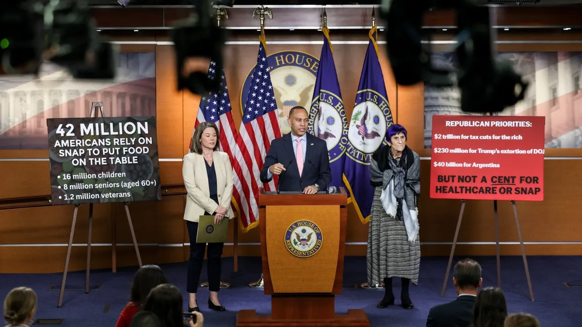 زعيم الأقلية الديمقراطية في مجلس النواب الأميركي حكيم جيفريز يتوسط النائبتين الديمقراطيتين أنجي كريج وروزا ديلاورو خلال مؤتمر صحافي في الكابيتول هيل بواشنطن العاصمة في الولايات المتحدة لمناقشة تأثير الإغلاق الحكومي على مخصصات قسائم الطعام والرعاية الصحية. 28 أكتوبر 2025 - REUTERS