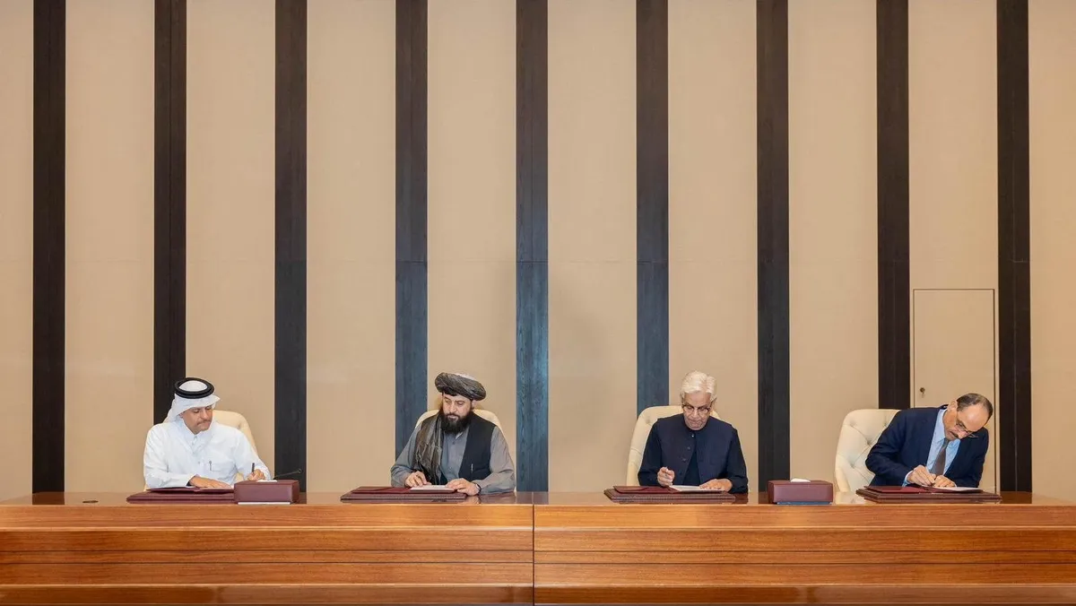 وزير الدفاع الباكستاني خواجة محمد آصف ونظيره الأفغاني الملا محمد يعقوب مجاهد خلال توقيع اتفاق وقف إطلاق النار بوساطة قطر وتركيا في الدوحة. 19 أكتوبر 2025 - Reuters