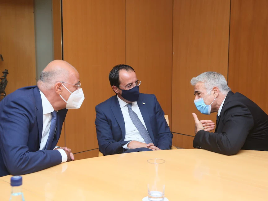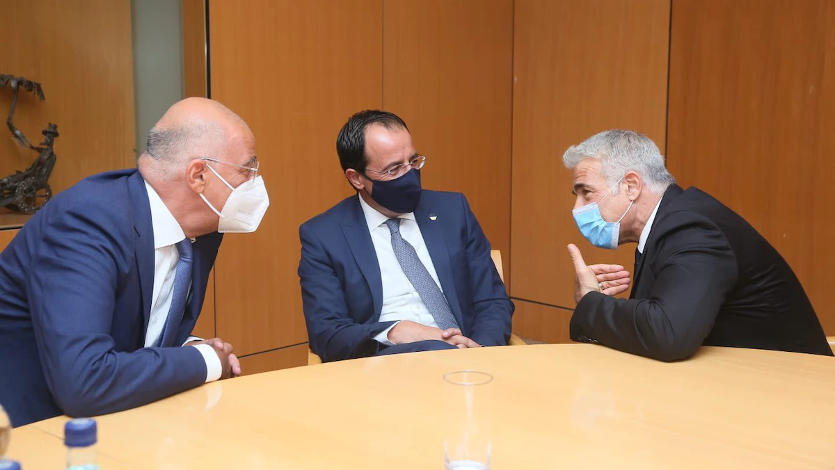 وزير الخارجية الإسرائيلي يائير لبيد، مع نظيريه اليوناني نيكوس ديندياس، والقبرصي نيكوس كريستودوليدس، 22 أغسطس 2021 - twitter@Christodulides