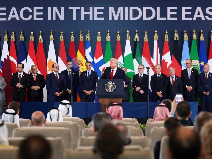 الرئيس الأميركي دونالد ترمب يلقي كلمة خلال قمة شرم الشيخ للسلام، مصر. 13 أكتوبر 2025 - Reuters