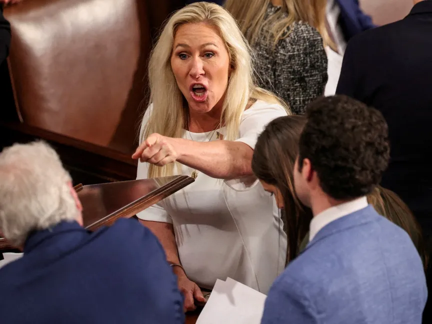 العضوة الجمهورية مارجوري تايلور جرين تشير بيدها إلى أحد الأعضاء في الكونجرس الأميركي. 3 يناير 2025 - REUTERS