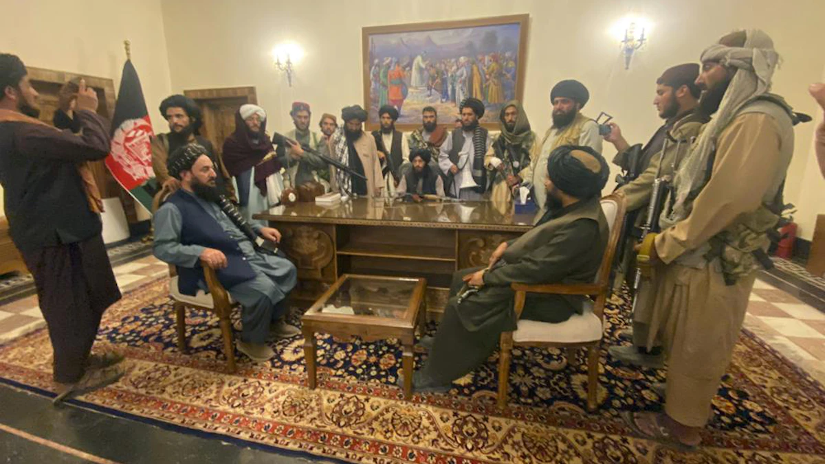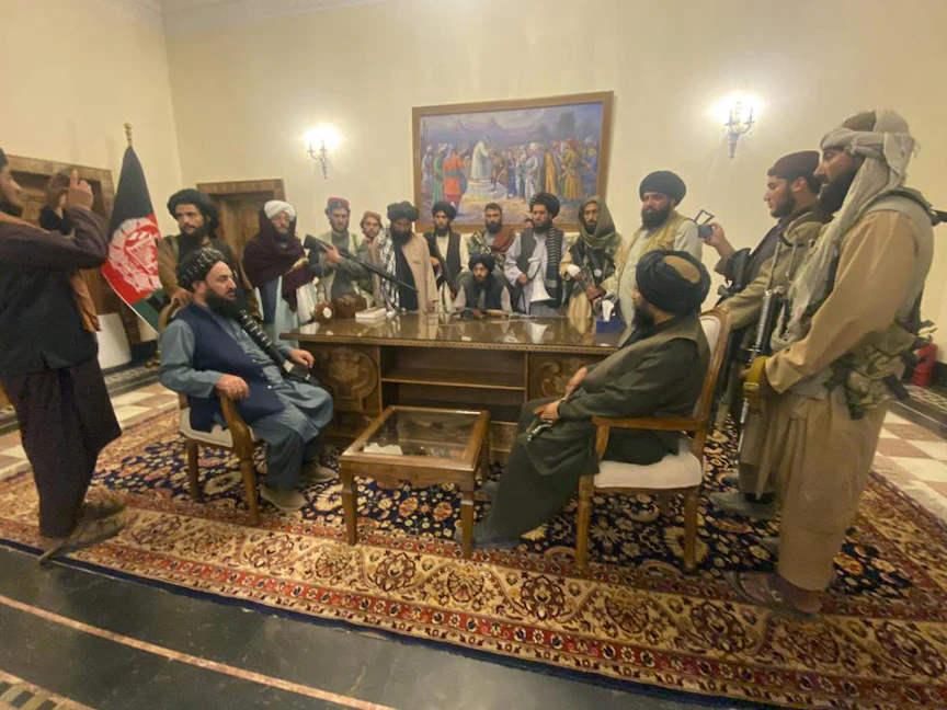 مسلحو حركة طالبان داخل قصر الرئاسة بعد السيطرة على العاصمة الأفغانية كابول - 15 أغسطس 2021 - AP