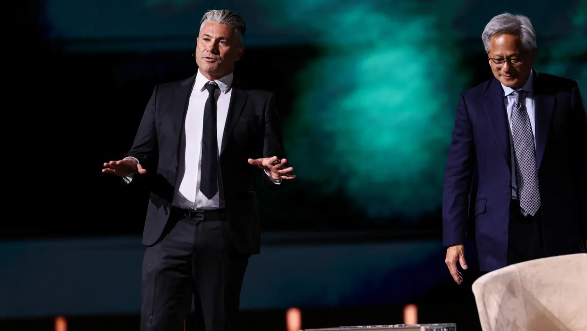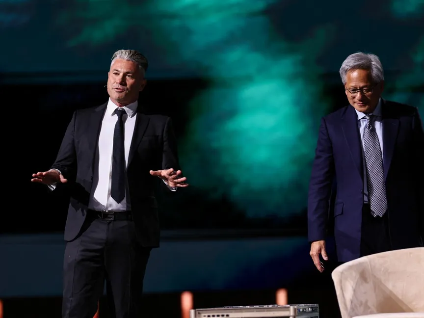 الرئيس التنفيذي لشركة "هيوماين" السعودية طارق أمين (يسار) وجنسن هوانج الرئيس التنفيذي لشركة إنفيديا منتدى الاستثمار السعودي الأميركي في الرياض. 13 مايو 2025 - Reuters