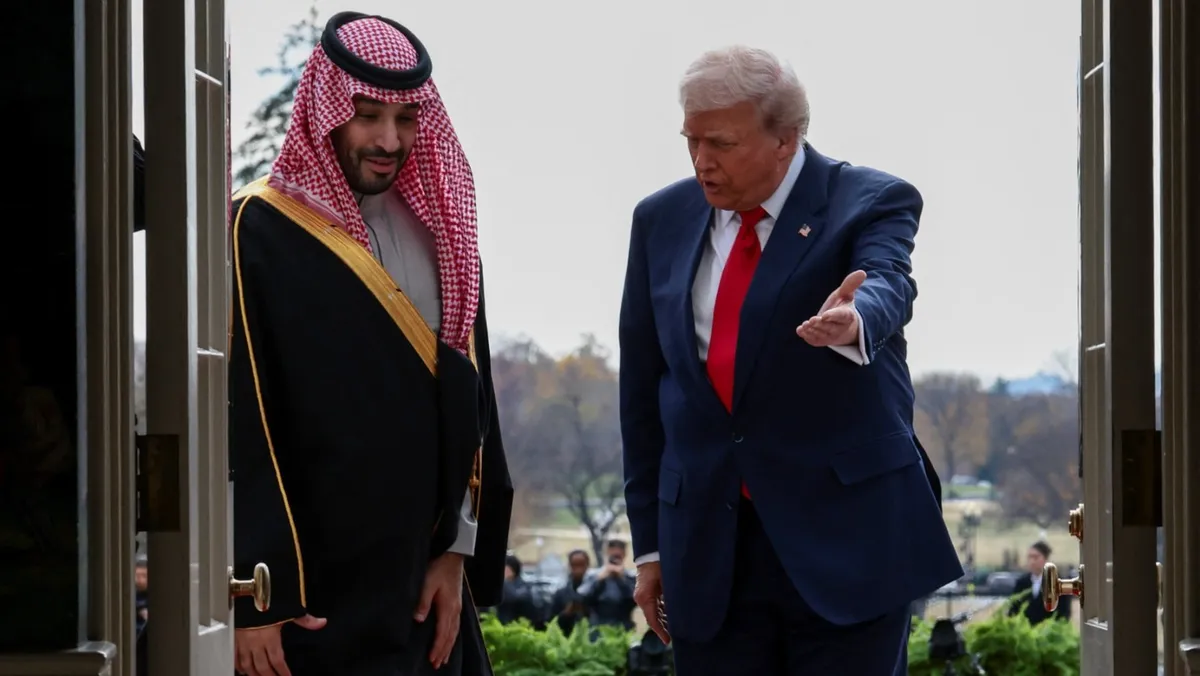 الرئيس الأميركي دونالد ترمب وولي العهد السعودي الأمير محمد بن سلمان يدخلان البيت الأبيض في العاصمة واشنطن بالولايات المتحدة. 18 نوفمبر 2025 - REUTERS