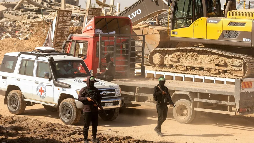 مقاتلون من حركة "حماس" يرافقون أعضاء الصليب الأحمر نحو منطقة داخل ما يسمى "الخط الأصفر في مدينة غزة. 20 نوفمبر 2025 - Reuters