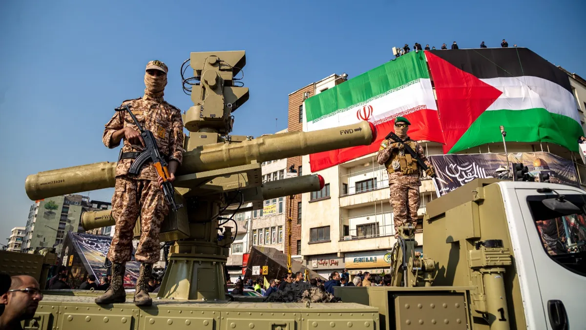 عناصر من الحرس الثوري الإيراني بجانب صاروخ "ماجد" المضاد للطائرات خلال مسيرة مناصرة لفلسطين في طهران بإيران. 24 نوفمبر 2023 - AFP