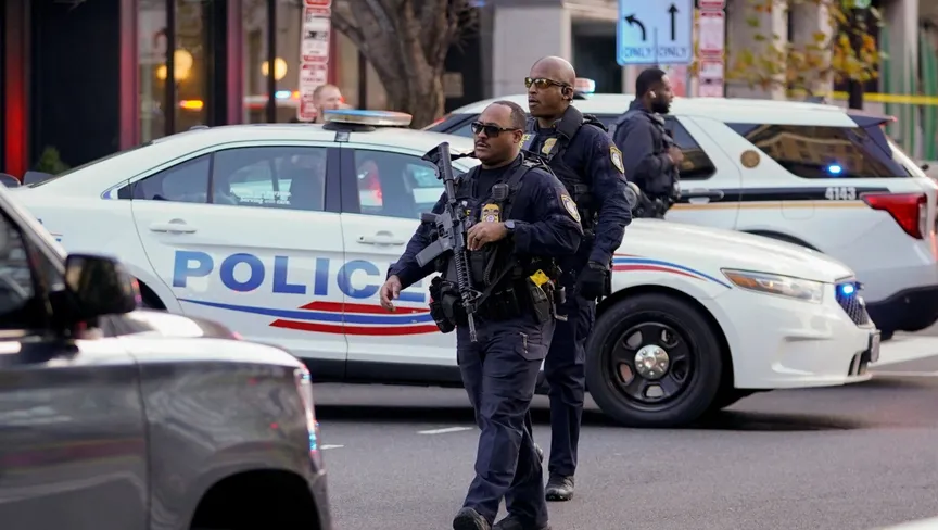 عناصر إنفاذ القانون يسيرون خلف شريط تحذيري أصفر مع مركبة شرطة متوقفة خلفهم بعد أن أُصيب عضوان من الحرس الوطني في إطلاق نار بالقرب من البيت الأبيض في واشنطن، الولايات المتحدة. 26 نوفمبر 2025 - Reuters
