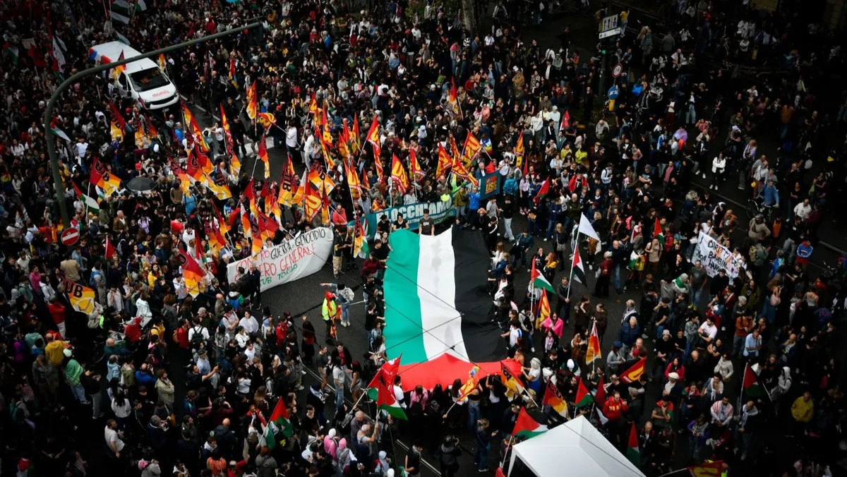 ونظمت نقابة "يو إس بي" يوماً آخر للاحتجاج الوطني، السبت، ضد ما اسمته "ميزانية الحرب" التي وضعتها رئيسة الوزراء الإيطالية جورجيا ميلوني، قائلة إن مشروع القانون المالي لعام 2026 يفضل الإنفاق العسكري على الاستثمار الذي تشتد الحاجة إليه في الصحة والتعليم والرعاية الاجتماعية.