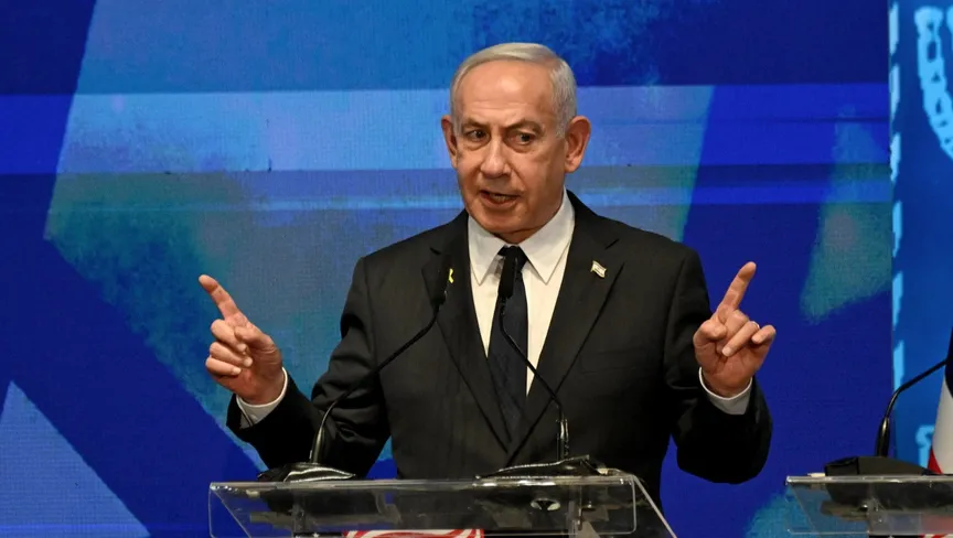 رئيس الوزراء الإسرائيلي بنيامين نتنياهو يتحدث في مبنى وزارة الخارجية الإسرائيلية بالقدس المحتلة. الاثنين 15 سبتمبر 2025 - REUTERS