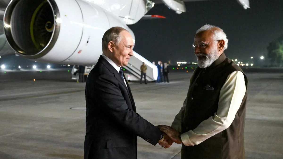 رئيس الوزراء الهندي ناريندرا مودي يستقبل الرئيس الروسي فلاديمير بوتن في قاعدة بالام الجوية بالعاصمة نيودلهي. 4 ديسمبر 2025 - رويترز